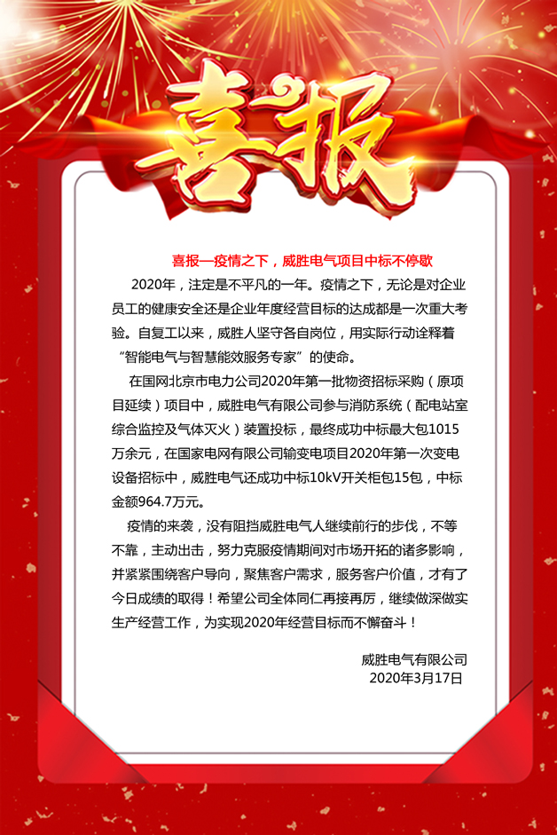 在國網(wǎng)北京市電力公司2020年第一批物資招標(biāo)采購(原項目延續(xù))項目中,威勝電氣有限公司參與消防系統(tǒng)(配電站室綜合監(jiān)控及氣體滅火)裝置投標(biāo),最終成功中標(biāo)最大包1015萬余元,在國家電網(wǎng)有限公司輸變電項目2020年第一次變電設(shè)備招標(biāo)中,威勝電氣還成功中標(biāo)10kV開關(guān)柜包15包,中標(biāo)金額964.7萬元。