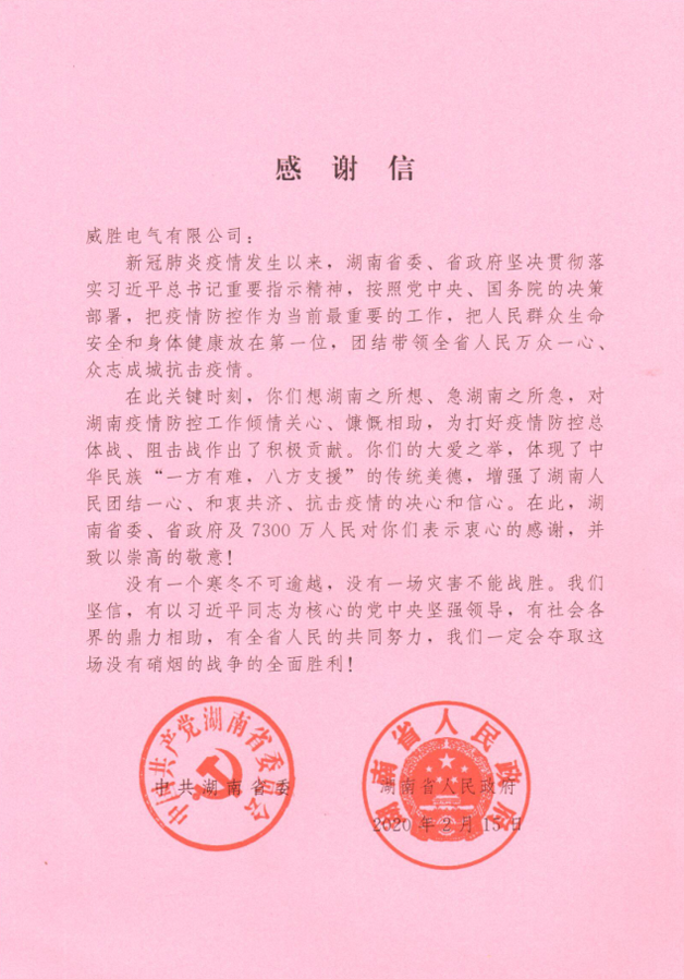 近期,威勝電氣先后收到來自中共湖南省委、湖南省人民政府及湖南省工商業(yè)聯合會的感謝信,信中表達了對威勝電氣在疫情期間馳援一線善舉的肯定與贊揚。