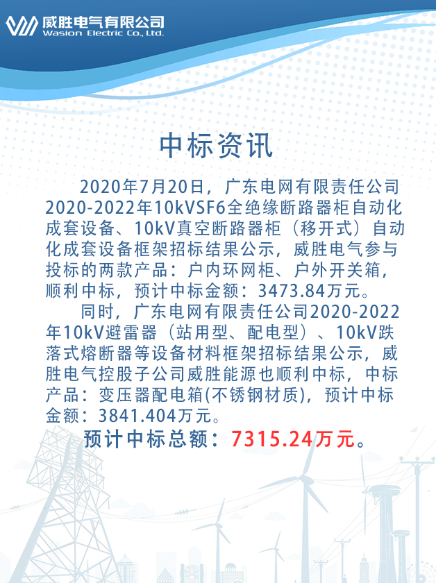 2020年7月20日,廣東電網有限責任公司2020-2022年10kVSF6全絕緣斷路器柜自動化成套設備、10kV真空斷路器柜(移開式)自動化成套設備框架招標結果公示,威勝電氣參與投標的兩款產品:戶內環網柜、戶外開關箱順利中標,預計中標金額:3473.84萬元。同時,廣東電網有限責任公司20202022年10kV避雷器(站用型、配電型)、10kV跌落式熔斷器等設備材料框架招標結果公示,威勝電氣控股子公司惟遠能源也順利中標,中標產品:變壓器配電箱(不銹鋼材質),預計中標金額:3841.404萬元。預計中標總額:7315.24萬元