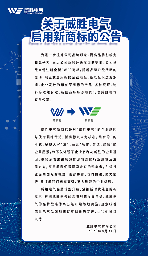 為進一步提升公司品牌形象,提高品牌影響力和競爭力,滿足公司業務升級發展的需要,公司已經申請注冊全新“WE”商標。隨著品牌升級戰略的啟動,現正式啟用新的企業商標,新老標識過渡期間,企業發放的印有原商標的產品、各種憑證、物料等依然有效,新舊商標標識等同代表威勝電氣有限公司。