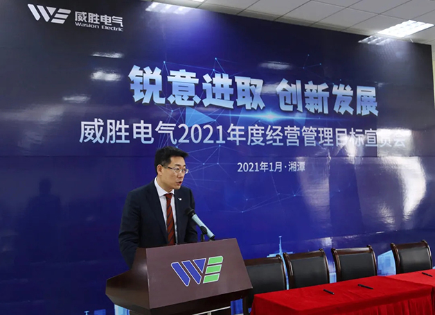 會上,曹朝輝女士宣讀了威勝電氣BG總裁任命書并對五五階段及2021年目標進行了宣貫:威勝電氣將堅持聚合資源協同發展,通過“賽道賽馬”和“金牛項目”,實現電氣業務縱深發展與戰略升級,成就新能源+系統解決方案為主賽道小獨角獸’的發展定位。