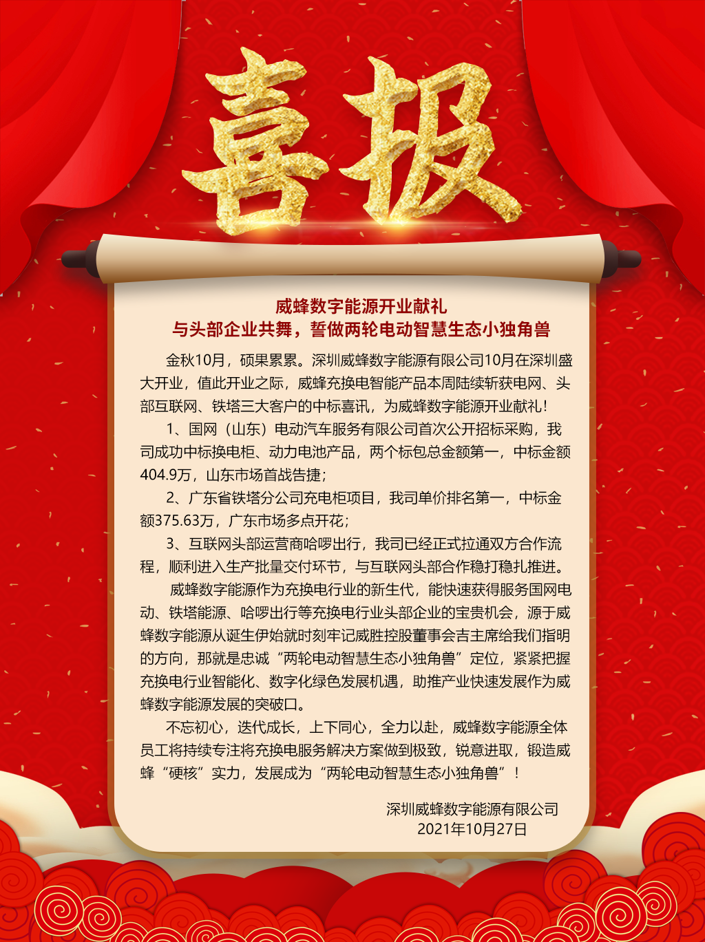 金秋10月,碩果累累。深圳威蜂數(shù)字能源有限公司10月在深圳盛大開(kāi)業(yè),值此開(kāi)業(yè)之際,威蜂充換電智能產(chǎn)品本周陸續(xù)斬獲電網(wǎng)、頭部互聯(lián)網(wǎng)、鐵塔三大客戶的中標(biāo)喜訊,為威蜂數(shù)字能源開(kāi)業(yè)獻(xiàn)禮!